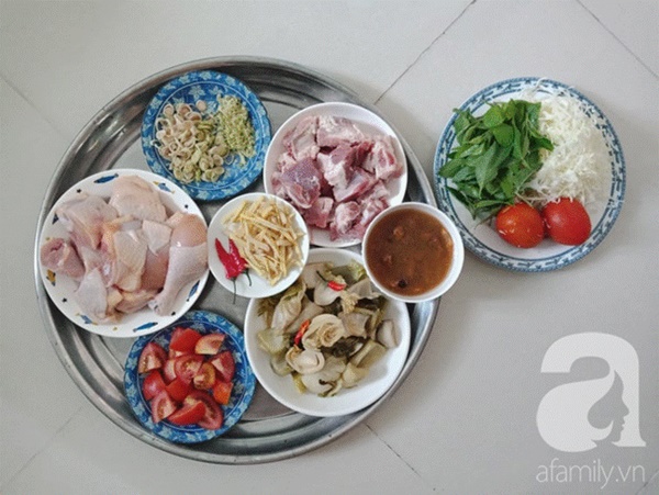 1. Thịt gà rửa sạch, chặt thành những miếng vừa ăn. Me cho vào chén cùng nước sôi, dằm ra để lấy nước cốt me. Sả cắt lát mỏng. Gừng cắt sợi. Ớt hiểm đập dập. Rau thơm, cà chua nhặt rửa sạch. Bắp cải bào sợi rửa qua nước lạnh và để ráo.