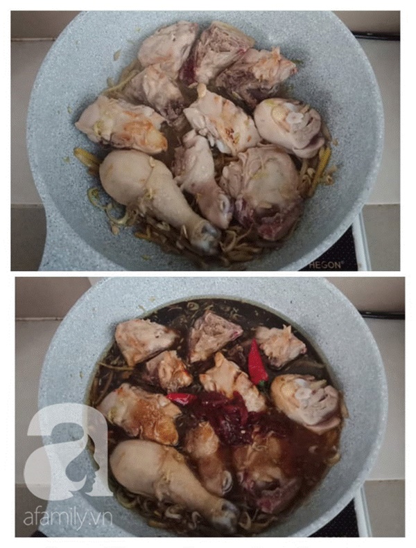 Nêm toàn bộ gia vị đã chuẩn bị vào, ram gà với lửa vừa, đảo cho gà thấm vị, thêm ớt hiểm đập dập.