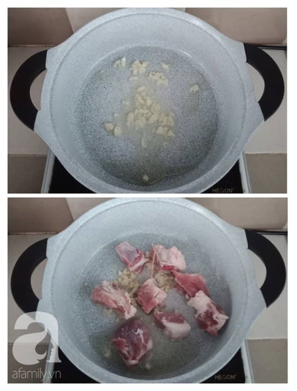 2. Làm nóng nồi với 2 muỗng canh dầu ăn, cho tỏi gừng vào phi thơm, cho tiếp sườn non vào xào chín săn giúp sườn thấm gia vị.