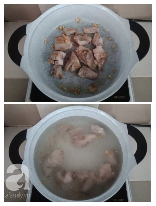 Khi sườn đã chín sém cạnh thì bạn cho 1.5 lít nước vào. Đun sôi, vớt bọt, đun lửa nhỏ 10 phút.