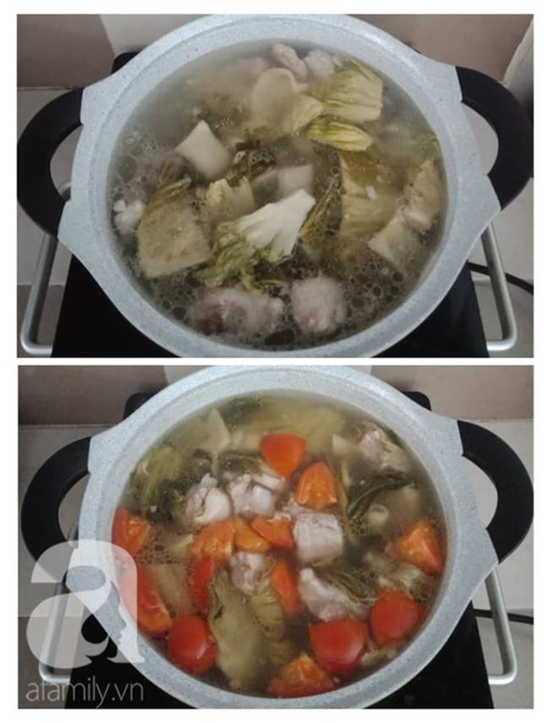 Cho tiếp dưa cải chua vào nấu cùng 10 phút nữa. Thêm cà chua và nêm 1 muỗng canh hạt nêm, 1 muỗng canh đường. Nấu thêm 5 phút, nêm thêm 2 muỗng canh nước mắm, dằn xíu muối. Nếm lại lần nữa, có thể thêm đường nếu thích vị miền Nam chua ngọt nhiều. Cho hành lá là hoàn tất. Tắt lửa.