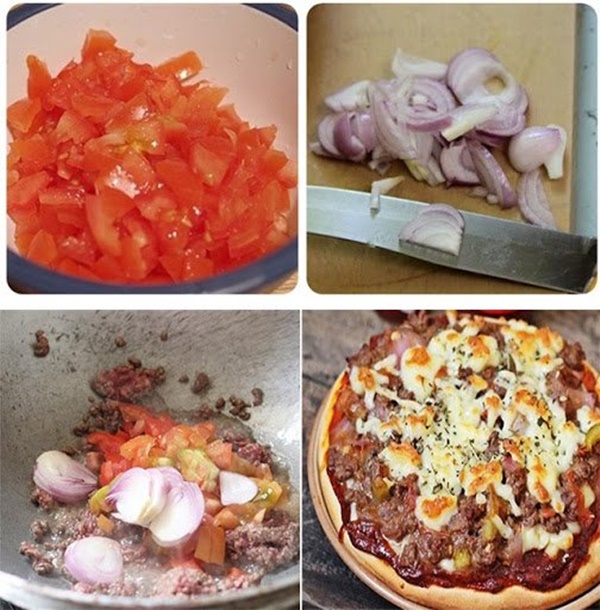 + Nhân bánh Pizza bò: Thịt bò xay ra chén, cà chua rửa sạch thái hạt lựu, hành tây bóc vỏ thái lát mỏng. Bắc chảo lên bếp cho 2 thìa dầu oliu đun nóng cho thịt bò xay vào xào 1-2 phút rồi cho cà chua và hành tây, ½ thìa hạt nêm và muối đảo đều đến khi chín thì tắt bếp cho ra đĩa.