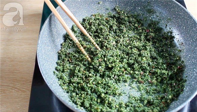 Cho hỗn hợp đã xay ra chảo, rang trên lửa thật nhỏ. Đảo đều đến khi hỗn hợp muối khô rang. Bạn có thể dùng muỗng hay vá để tán cho rau răm tơi ra.