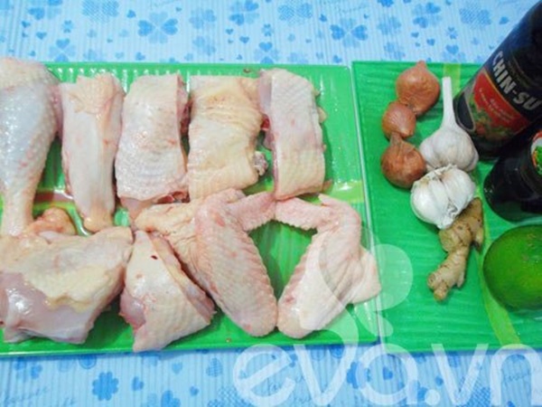 - Cánh gà bóp muối rửa sạch, chặt miếng vừa ăn