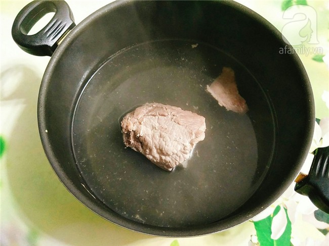 Thịt nạc rửa sạch rồi cho vào nồi nước, bật bếp luộc cho miếng thịt chín thì vớt ra để nguội bớt.