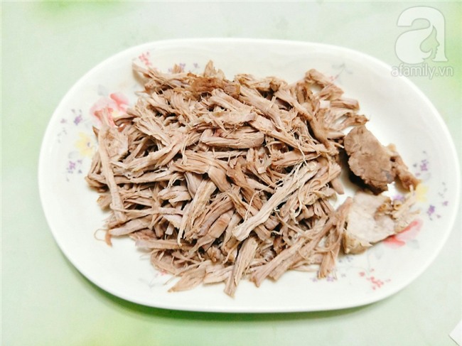 Thịt sau khi đã nguội thì đem xé thành sợi dài vừa nhỏ, tuy nhiên bạn cũng không cần xé quá nhỏ.