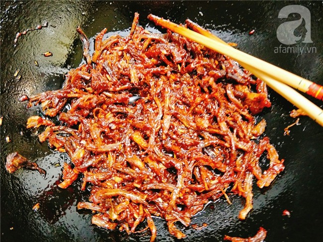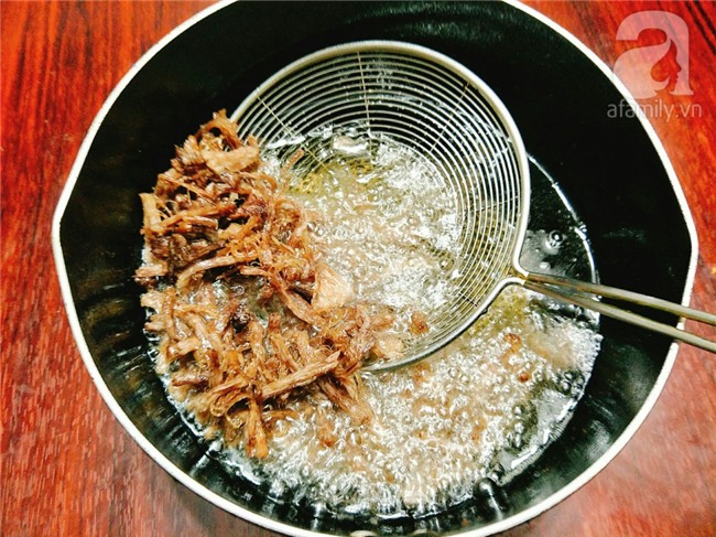 Đổ nhiều dầu vào nồi sau đó đun cho dầu sôi lên, tiếp đến bạn cho tất cả thịt đã xé sợi vào chiên, đảo đều và chiên khoảng 1-2 phút cho thịt xém vàng rồi vớt ra cho ráo dầu.