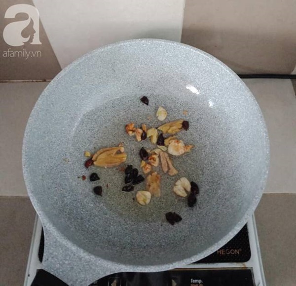2. Làm nóng chảo với 2 muỗng canh dầu, cho tỏi, gừng, hoa hồi vào xào thơm.