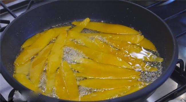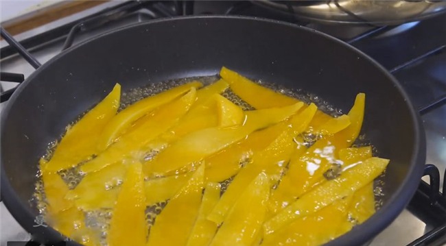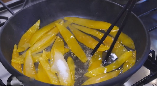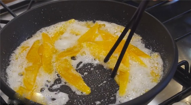 Khi thấy lớp bong bóng trắng dần lớn lên ở trong chảo, hạ nhỏ lửa dần rồi tắt hẳn cho đến khi thấy lớp bọt xốp trắng gần như cạn hết thì tắt lửa. Từng miếng vỏ cam lúc này phủ một lớp bọt đường trắng xóa.