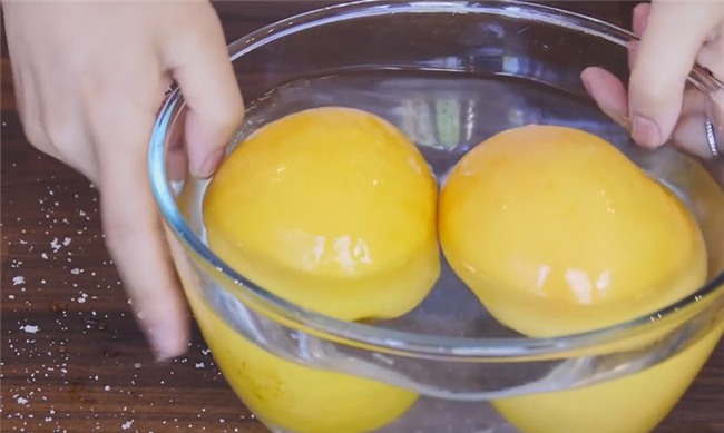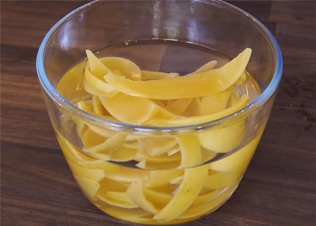 Khi nước vừa sôi thì tắt bếp, vớt vỏ cam ra ngâm vào bát nước mát. Để nguyên vỏ trong bát nước đó qua một đêm. Bước này cũng giúp khử bớt vị the đắng của vỏ cam.