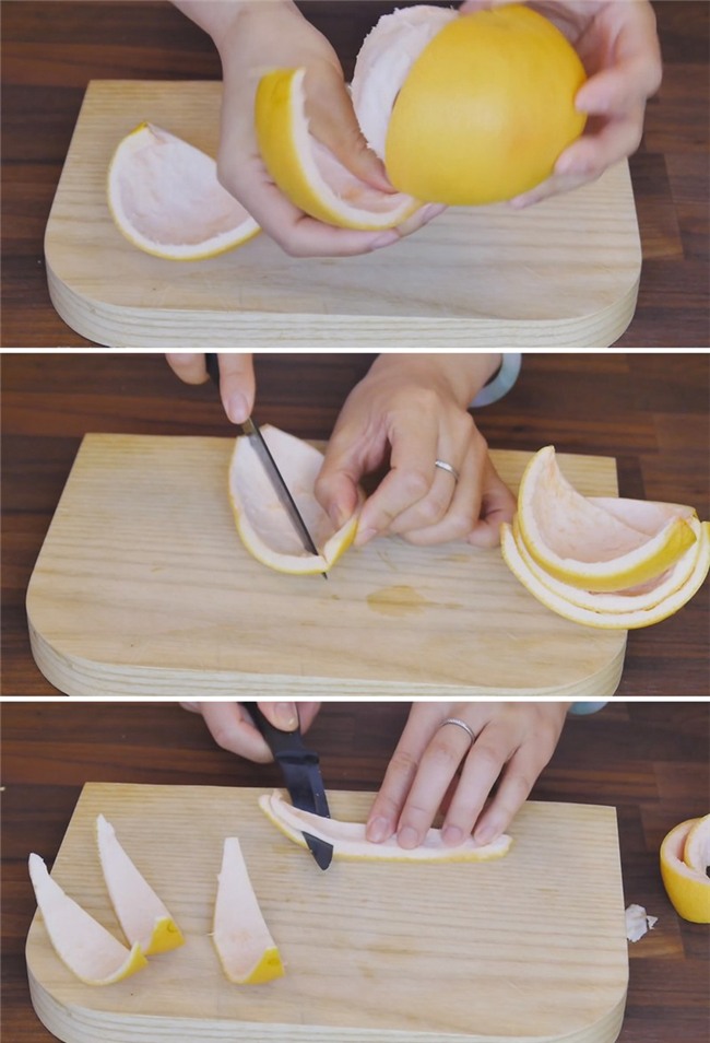 Từ các đường cắt, lột lớp vỏ cam ra khỏi lớp cùi trắng.
