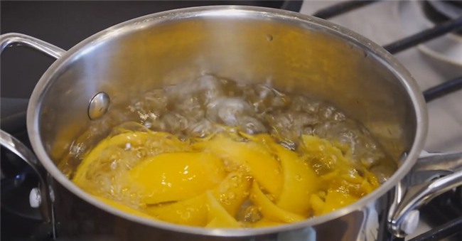 Sau khi ngâm qua đêm, vớt vỏ cam ra, tiếp tục cho vào nồi nước luộc sôi thêm lần nữa. Đến bước này thì vị đắng của vỏ cam gần như đã bị loại bỏ hoàn toàn. Nước sôi thì tắt lửa, đổ vỏ ra rổ thưa cho ráo.