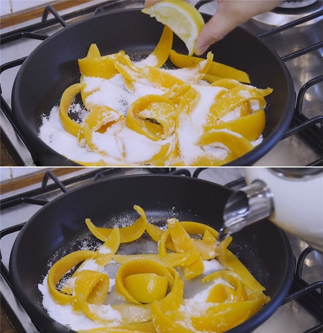 Trút vỏ cam vào chảo có đáy dày. Thêm ½ lượng đường vào, vắt nước cốt của ¼ quả chanh và sau cùng là rót thêm chừng 150ml nước lọc.