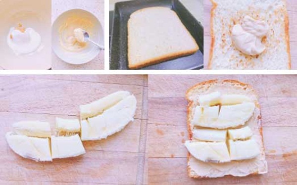 Cách làm bánh mì kẹp chuối - Cho bơ đậu phộng vào bát, thêm sữa chua vào trộn đều. - Đặt lát bánh mì lên chảo chống dính, chiên chín giòn hai mặt sau đó cho lát bánh mì ra thớt, phết đều bơ đậu phộng đã trộn sữa chua lên trên một mặt của cả hai lát bánh. - Chuối bóc bỏ vỏ rồi ép dẹt, cắt làm đôi. Cho chuối lên trên lát bánh mì đã phết bơ sữa chua. - Đặt phô mai lên trên chuối sau đó kẹp lát bánh mì còn lại được phết bơ sữa chua vào là xong. |