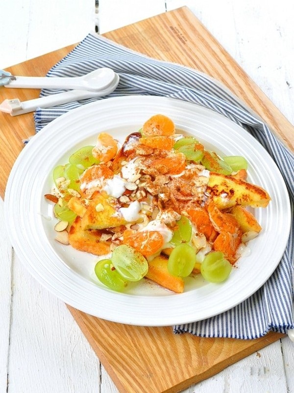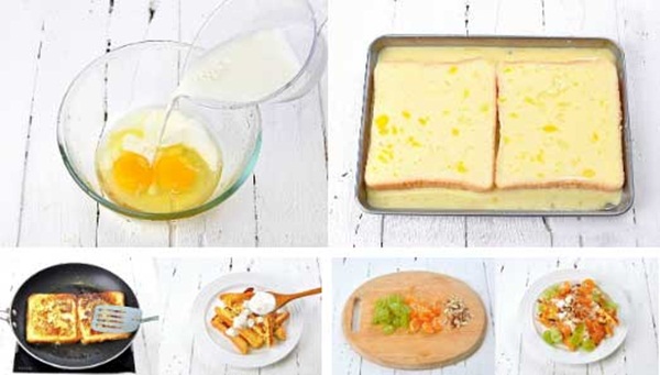 Nguyên liệu: Salad: 2 lát bánh mì, 10 quả nho xanh, 1 quả quýt, 2 thìa canh hạnh nhân thái lát, 1 hộp sữa chua. Phần trứng sữa tẩm bánh mì: 2 quả trứng, 80ml sữa tươi, 8g đường, một ít muối, bột quế.