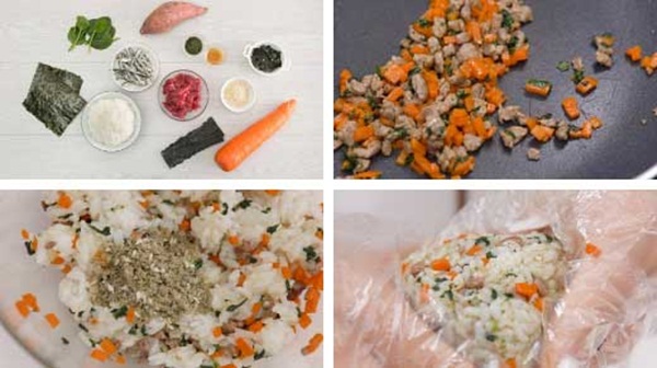 Cách làm cơm nắm thịt bò - Cắt lát 5g khoai lang và nướng trong lò đến khi khoai khô hẳn. Rang cá cơm khô và tảo biển trên chảo để bay bớt mùi tanh. Sau đó cho khoai lang, cá cơm và rong biển vào máy xay sinh tố, xay thật nhuyễn. Trộn đều hỗn hợp này với mè rang. - Băm nhỏ thịt bò, cải bó xôi và thái hạt lựu cà rốt. Cắt lá rong biển khô thành 3 miếng có kích thước 1,5 x 8cm để trang trí. - Làm nóng chảo với một ít dầu mè, dầu nóng cho thịt bò vào xào đến chín tái. Lúc này thêm vào chảo 30ml nước, cà rốt và cải bó xôi. Đảo đều các nguyên liệu đến khi chín. - Cho tất cả các nguyên liệu đã sơ chế và 3g hỗn hợp gia vị xay đã chuẩn bị ở bước 1 vào một bát lớn, trộn đều. - Nắm cơm thành hình tam giác và trang trí thêm bằng lá rong biển khô. |
