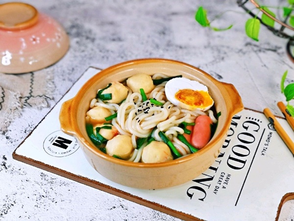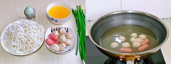Đổ nước dùng gà vào nồi, thêm lượng nước thích hợp cùng viên chả tôm (hoặc cá hoặc bò viên) và xúc xích vào.