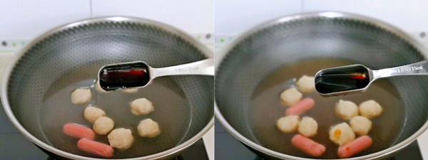 Thêm dầu hào, nước tương vào nồi nước dùng sau đó đun sôi ở lửa lớn cho xúc xích và tôm viên chín.