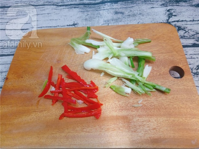 Ớt đỏ rửa sạch thái sợi nhỏ, phần đầu hành lá rửa sạch đập sơ rồi thái sợi dài.