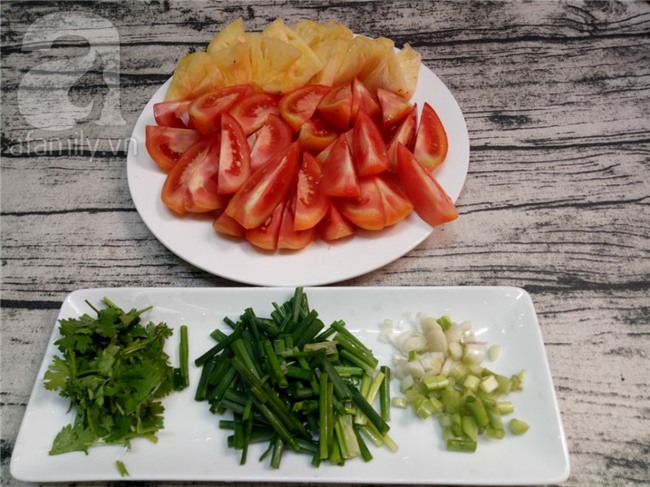 Cà chua thái múi cau, dứa thái mỏng, hành lá thái khúc.