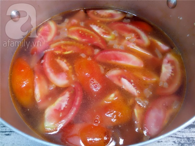 Đặt nồi lên bếp, cho tí dầu ăn vào chờ nóng rồi phi thơm đầu hành. Sau đó, cho cà chua vào xào nhanh tay rồi cho nước nóng vào cùng với gia vị, nấu trên lửa vừa.