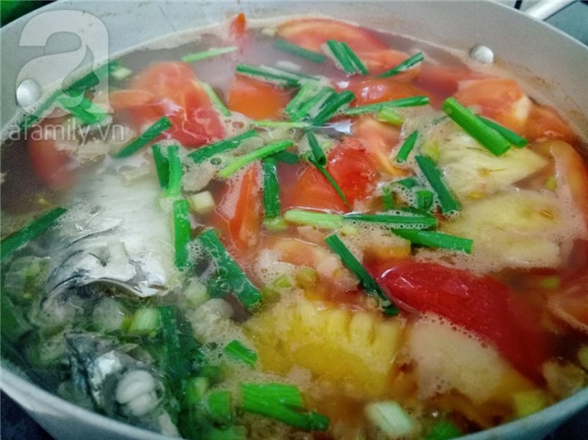 Khi nồi canh bắt đầu sôi thì cho cá vào. Khi canh sôi lên lần nữa thì cho dứa vào. Canh sôi lên lần nữa thì nêm nếm lại gia vị cho vừa ăn rồi cho hành lá và tiêu vào rồi tắt bếp.