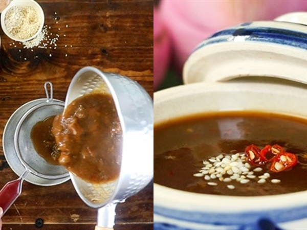 - Bắc nồi lên bếp, cho nước và cả vắt me vào đun sôi đến khi me mềm thì bỏ phần hạt và xác, lọc lấy nước cốt để làm sốt me.