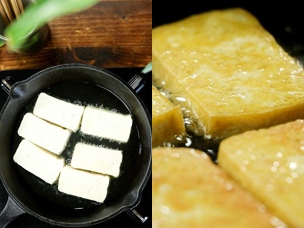 - Bắc chảo dầu lên bếp, chờ dầu nóng thì cho đậu phụ vào rán vàng hai mặt. Vớt đậu phụ ra giấy thấm dầu để món ăn không bị ngấy.