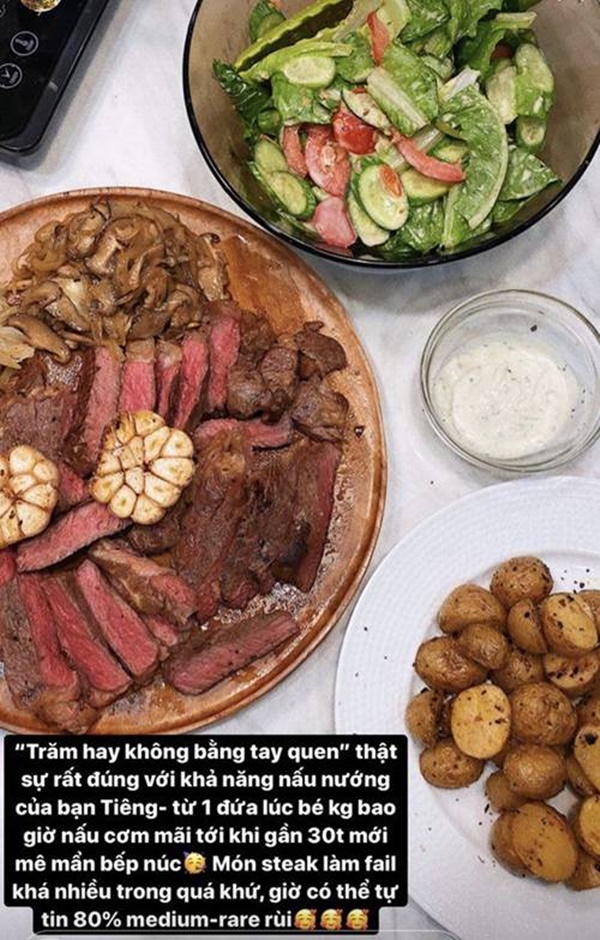 Cùng với đó, Tóc Tiên khoe món bít tết cô làm và cho biết mình từng thất bại nhiều lần trong quá khứ khi thực hiện món ăn này. Giờ cô đã có thể "tự tin 80% medium-rare". "Medium rare" là mức thịt cân bằng sống chín, bên ngoài vàng nâu, bên trong đã ấm hoàn toàn, màu đỏ tươi ở giữa miếng thịt nhạt đi và phần hồng nhiều hơn. Muốn đạt ở mức này thịt cần nướng thịt trong 3 - 4 phút mỗi mặt, canh đều thời gian.