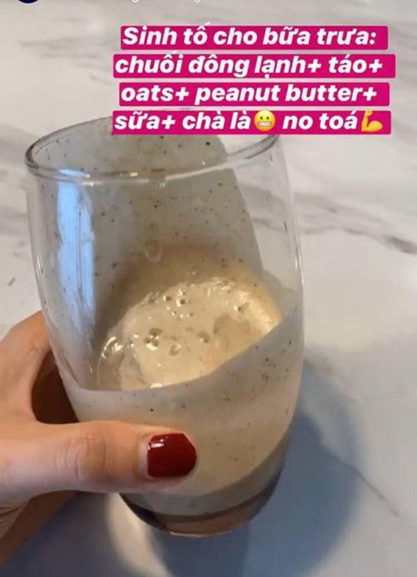 Sinh tố của Tóc Tiên tổng hợp từ chuối - táo - yến mạch - bơ đậu phộng - sữa - chà là.