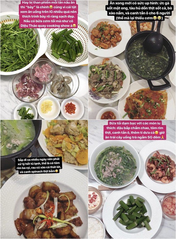 Những bữa cơm do Tóc Tiên thực hiện có khi đơn giản với những món truyền thống như thịt rang cháy cạnh, cá kho, canh tôm chua, rau tần ô... có khi lại sang chảnh với cá hồi, bít tết mang phong cách Tây.