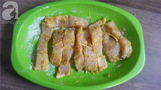 Cá phi lê rửa sạch để ráo nước, cắt khúc vừa, tẩm ướp với phần hỗn hợp sả, gừng, ớt vừa xay, thêm chút bột nêm khoảng 15 phút cho ngấm.