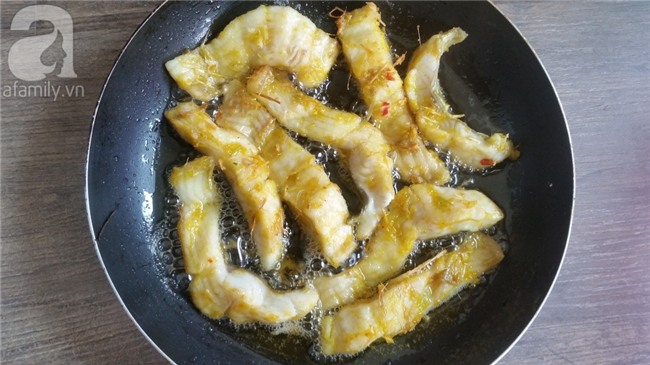 Khi cá đã vàng, cho ra giấy thấm dầu, để ráo rồi xếp ra đĩa, dùng nóng kèm tương ớt hoặc nước mắm cay.