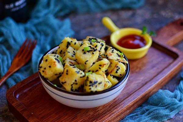 Bánh này có thể ăn kèm cùng tương cà chua hoặc tương ớt cho tăng thêm hương vị đậm đà.