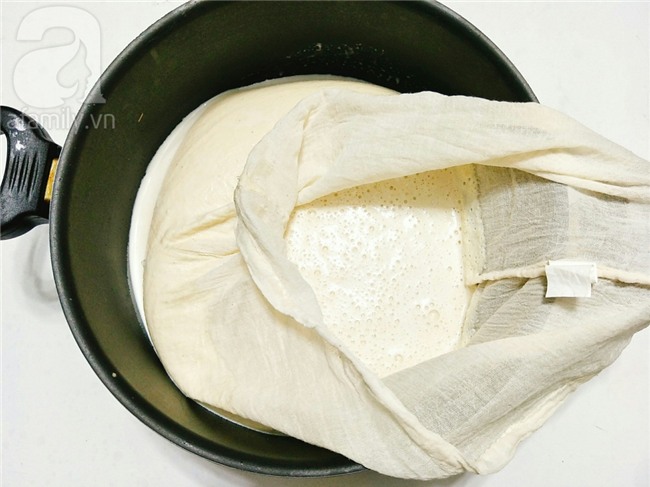 Đổ vào túi lọc đậu, bên dưới đặt 1 cái nồi để hứng lấy nước sữa đậu và tiếp tục xay nốt số đậu còn lại với 400ml nước để lọc lần thứ 2. Túm miệng túi và vắt lấy nước sữa đậu nành, tiếp theo bạn thêm lượng nước còn lại và nhồi bóp cho phần bã đậu ra hết chất sữa sau đó vắt lấy nước sữa lần cuối cùng.