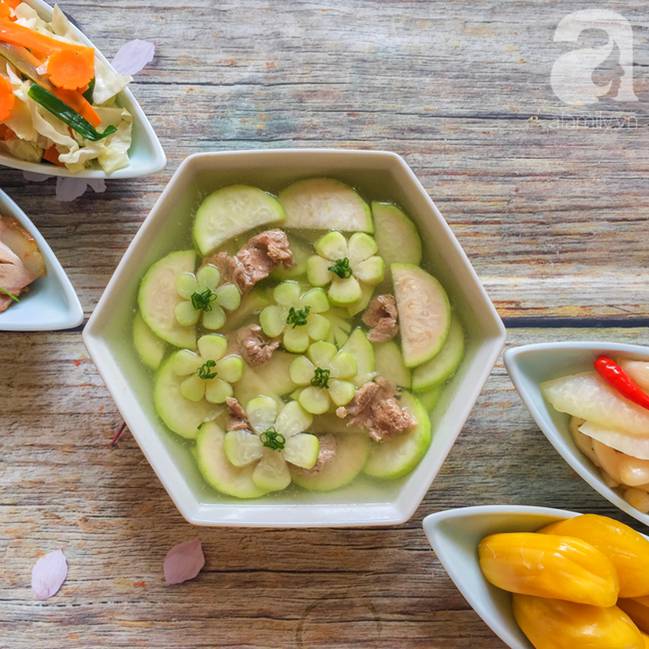 Bầu gọt vỏ cắt lát rồi tỉa hoa từng khúc nếu muốn. Bắc nồi nước sôi, cho sườn vào, khi sôi lại vớt bọt sạch. Nêm nếm lại vừa ăn rồi thả bầu vào. Đợi sôi lại tắt bếp và cho hành ngò vào canh là xong.