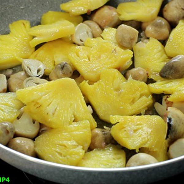 Bắc chảo nóng, cho dầu ăn và hành tím vào phi thơm. Cho 200gr dứa và 100gr nấm rơm vào đảo sơ khoảng 5 phút thì tắt bếp, để riêng một bên.