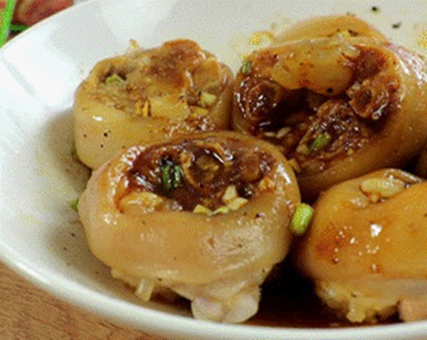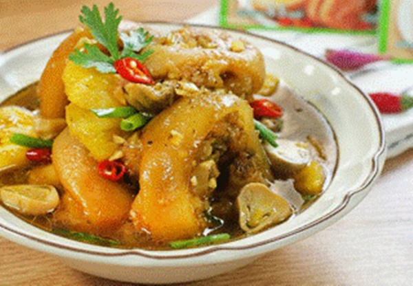 Món chân giò kho dứa thật đẹp mắt và hấp dẫn khi kết hợp khéo léo các loại trái cây vào thức ăn. Nhờ có những lát dứa chua nên những thớ thịt chân giò không bị khô mà rất mềm mượt, vừa miệng không hề bị ngấy vì cân bằng đủ cả vị ngọt lẫn vị chua. Món chân giò kho dứa ngon còn bởi thịt chân giò được nấu mềm rất thấm gia vị cùng với lớp nước thịt sánh lại rất hấp dẫn. Ngày lạnh, ăn cơm nóng với món chân giò kho dứa là tuyệt nhất đấy!