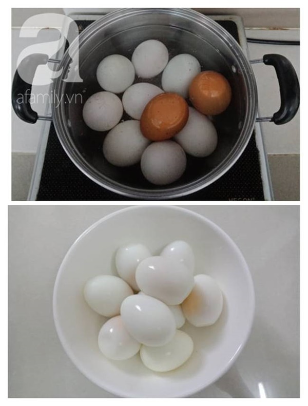 3. Trứng cho vào nồi có chút giấm và muối, luộc chín. Trứng chín ngâm nước lạnh cho nguội và bóc vỏ.