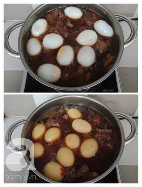 4. Khi nước trong nồi thịt kho cạn 1/2 nước kho thì cho trứng luộc đã bóc vỏ vào. Đun riu riu cho đến khi thịt mềm vừa ý thì mở to lửa cho thịt lên màu đẹp là hoàn tất, tắt bếp.