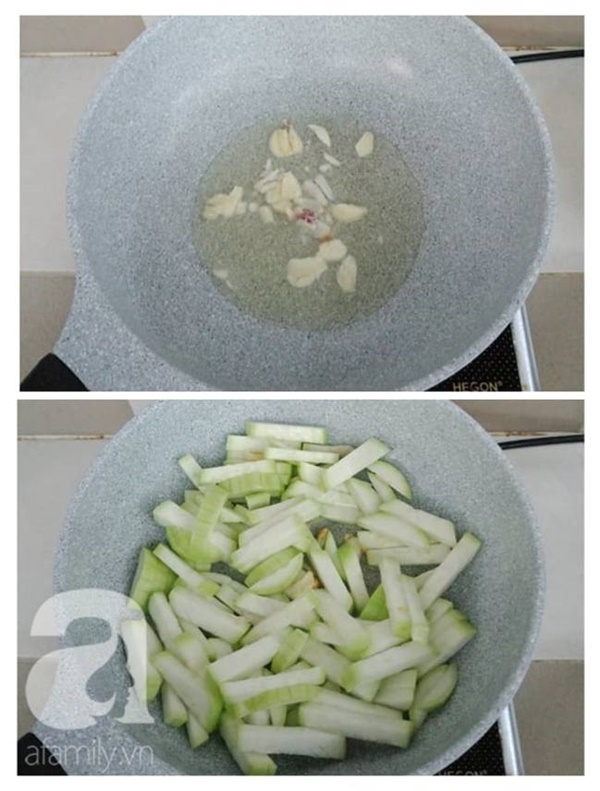 2. Làm nóng chảo với 2 muỗng canh dầu ăn, cho tỏi vào phi thơm. Tiếp đến cho bầu vào xào chín tái.
