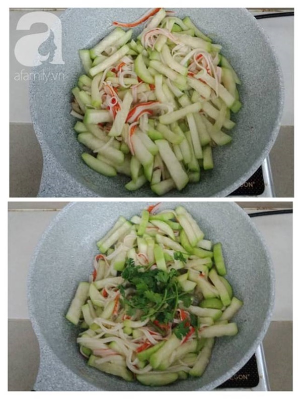 Nêm 1/3 muỗng cà phê muối, 1 muỗng cà phê hạt nêm, đảo đều cho bầu thấm gia vị rồi cho thanh cua vào, xóc đều, tắt lửa.