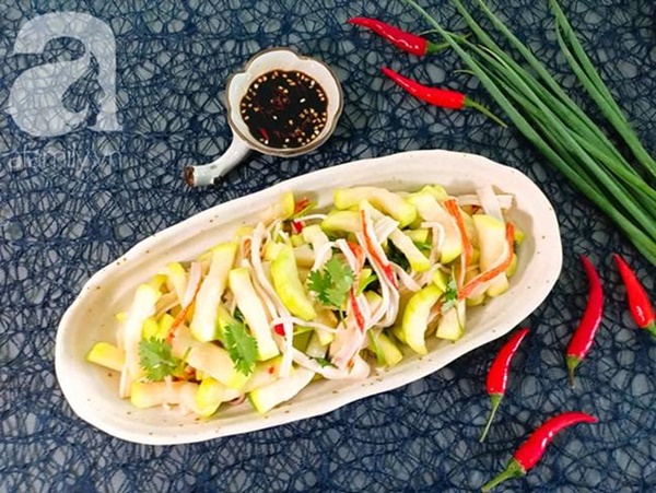 Cho bầu xào thanh cua ra đĩa, dọn kèm chén nước tương có vài lát ớt. Dùng nóng!