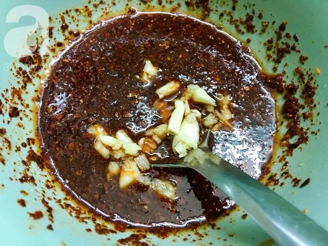 Ở chén khác, trộn 3 muỗng ớt bột Hàn loại không cay và 1 muỗng ớt cay, 2 muỗng canh nước mắm, 2 muỗng canh siro bắp hoặc thay bằng 1 muỗng đường trắng, 1 muỗng canh dầu mè, 3 muỗng canh nước mơ ngâm có thể thay bằng 2 muỗng giấm. Thêm tỏi băm rồi trộn đều.