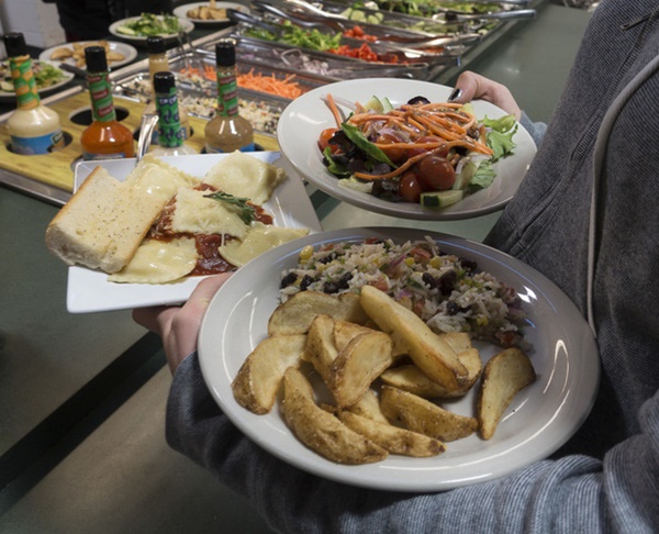 Hai lý do để các nhà hàng phục vụ phần lớn các món ăn trong menu làm từ rau và đồ nhiều tinh bột là: 1 - chúng rẻ, 2 - chúng khiến no nhanh và lâu. Nếu để ý, bạn sẽ thấy các khay đồ ăn nhiều tinh bột, rau củ sẽ được bày nhiều và gần hơn, còn các món đạm sẽ bị cắt nhỏ, khay bày cũng lùi dần vào bên trong.