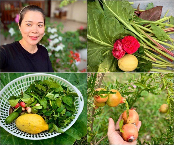 Cô trữ thực phẩm vừa phải trong mùa dịch, các loại cá được gửi từ Đà Nẵng, nuôi 10 con gà đẻ, trong vườn nhà thì luôn bạt ngàn rau "ăn ngập mặt": Bạc hà, mướp, bầu bí, bó xôi, cải dún, cải ngồng, cải bẹ xanh, cải kale, rau dền, dưa leo, mồng tơi, cà chua, rau thơm đủ loại ớt, chanh, riềng, gừng, sả, hành, ngò gì cũng có.