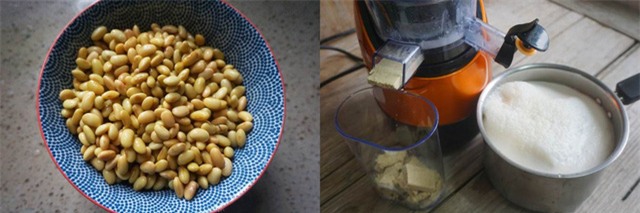 Ngâm đậu nành qua đêm cho nở. Cho đậu đã ngâm và 1200ml nước vào máy xay sinh tố hoặc máy ép nước để xay lọc lấy phần nước đậu nành.