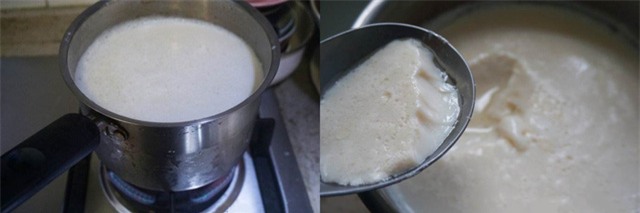 Sữa đậu nành sau khi lọc cho vào nồi đun sôi rồi tắt lửa. Để sữa nguội bớt rồi cho đường nho vào khấy đều rồi đóng nắp nồi sữa lại đợi khoảng 10 phút cho sữa đông thành tào phớ.