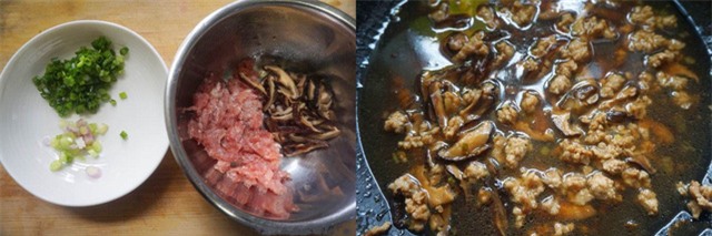 Hành lá nhỏ riêng phần gốc và phần lá, nấm hương ngâm nở thái lát. Đun nóng một ít dầu ăn trong chảo, cho gốc hành vào xào thơm tiếp đó cho thịt băm và nấm hương vào đảo cùng, thêm nước tương vào đảo cho thấm gia vị. Cuối cùng thêm lượng nước vừa ăn vào đun sôi. Rắc thêm chút hành lá và hạt tiêu rồi tắt bếp.