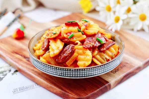 Kim chi xào khoai tây và lạp xưởng chua cay nóng hổi là một món ăn ngon miệng, bổ dưỡng mà lại không hề ngán ngấy. Thi thoảng bạn hãy thay đổi khẩu vị cho cả nhà với món này nhé!